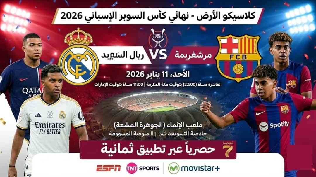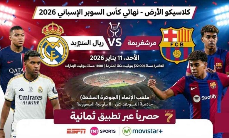 مباراة برشلونة وريال مدريد في نهائي السوبر الإسباني 2026 تُعد من أبرز الأحداث الرياضية لهذا الموسم. بتوقيتات متعددة وقنوات مختلفة حول العالم، تتاح الفرصة للجمهور في كل مكان لمتابعة الكلاسيكو التاريخي. سواء كنت من مشجعي برشلونة، ريال مدريد، أو مجرد محب لكرة القدم، فإن هذه المواجهة تقدم لك تجربة فريدة من نوعها. الاعتماد على المصادر الرسمية للبث ومعرفة القنوات والتوقيت بدقة يساعدك على عدم تفويت هذه اللحظة الكروية الهامة. استعد للمباراة، وضع تذكيرًا في جدولك، واستمتع بأجواء الكلاسيكو بين عظماء كرة القدم.